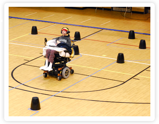 Sistema inalámbrico controlado mediante la lengua para pacientes paralizados: Los investigadores financiados por el NIBIB están desarrollando una tecnología de asistencia mediante la lengua llamada Sistema Tongue Drive (TDS por sus siglas en inglés). La tecnología básica TDS explota el hecho de que aún las personas con parálisis severa, que impide el movimiento de las extremidades, la respiración y el habla, pueden todavía mover su lengua y por lo tanto pueden utilizar plenamente este extraordinario sistema. El dispositivo consiste de un auricular, una computadora compacta y un imán diminuto adherido a la lengua. Movimientos simples de la lengua envían comandos a la computadora permitiendo a los usuarios direccionar sus sillas de ruedas, operar sus computadoras y en lo general controlar su entorno de manera independiente. Los investigadores continúan mejorando el sistema para que no sea visible, reduciendo el tamaño de la computadora y reemplazando el auricular necesario para detectar las señales de la lengua con sensores diminutos colocados dentro de la boca del usuario.Un hombre guía su silla de ruedas alrededor de una pista de obstáculos utilizando el sistema de imán lingual y auricular. Fuente: M. Ghvanloo, Instituto Tecnológico de Georgia.