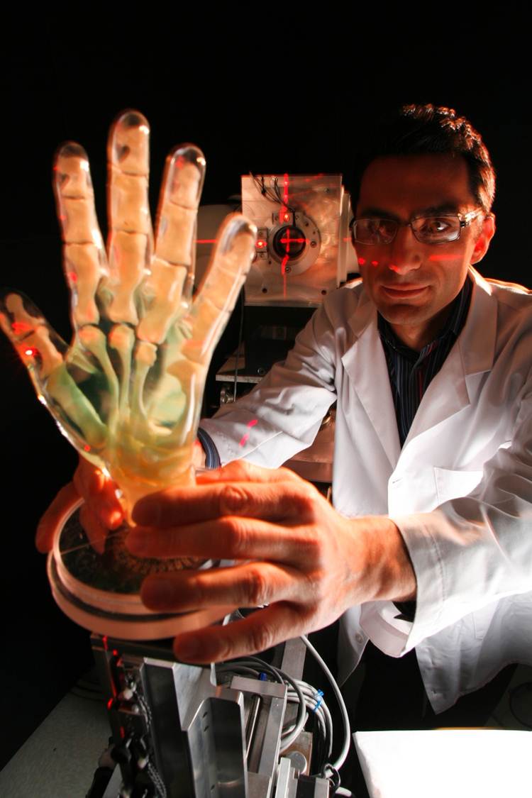 Manos artificiales con capacidad de movimientos complejos y sensación: Las personas con amputación de mano esperan que las prótesis modernas de mano funcionen como manos intactas. Las prótesis de mano de tecnología de vanguardia básicamente controlan dos movimientos “abrir” y “cerrar”. Como resultado, la mayoría de los dispositivos de vanguardia no cumplen con las expectativas del usuario y son subutilizados o rechazados. Por lo tanto, los investigadores del NIBIB están desarrollando nuevos sistemas de manos artificiales que realicen movimientos de mano complejos, basados en las mediciones de las señales eléctricas residuales de los músculos restantes del antebrazo de un amputado. Las señales de los músculos (en un proyecto) y los nervios (de otro proyecto) tienen el potencial de resultar en un control mucho más fino de los dedos en la mano artificial. Además, uno de los equipos está trabajando en capturar el sentido del tacto, de manera que en el futuro los usuarios podrán también “sentir” lo que están sosteniendo con su mano artificial.