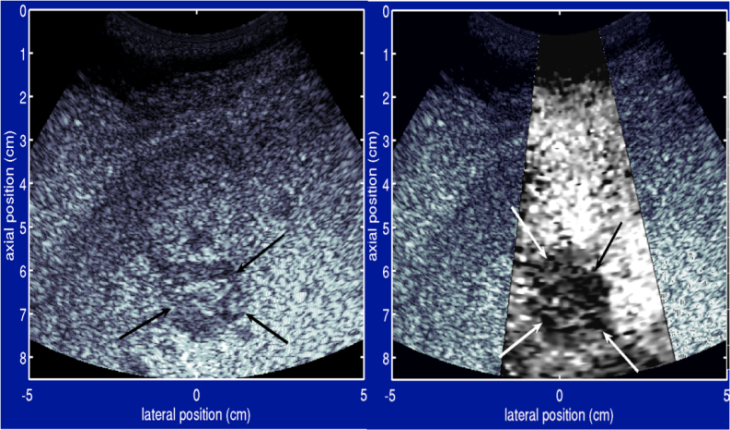 Otra forma funcional del ultrasonido es la elastografía, un método para medir y desplegar la rigidez relativa de los tejidos, la cual se puede utilizar para diferenciar los tumores de tejido sano. Esta información se puede desplegar como mapas codificados por color de la rigidez relativa; mapas en blanco y negro que despliegan imágenes de alto contraste de los tumores, comparadas con las imágenes anatómicas; o mapas codificados por color superpuestos en la imagen anatómica.