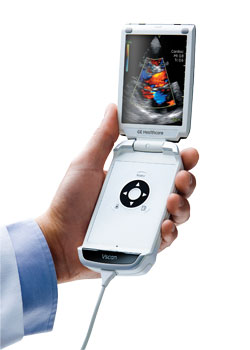 Transductores miniatura y matrices de bajo costo.Mediante el uso de nuevos materiales para transductores y nuevos métodos de fabricación, se pueden producir matrices de ultrasonido de manera similar a la producción de chips de computadoras. Un tipo transductores nuevos, llamados CMUTs, son menos costosos de producir, más fáciles de fabricar como matrices, y tienen varias ventajas sobre los transductores estándar.Esta nueva tecnología CMUT se utilizó recientemente en un aparato desarrollado con financiamiento del NIBIB llamado Escáner Vscan de GE. El escáner Vscan es un escáner de ultrasonido del tamaño de la palma de la mano, que tiene la capacidad tanto de imágenes anatómicas como de Doppler a color. El aparato está actualmente en uso clínico y cuesta considerablemente menos que un escáner de ultrasonido de tamaño completo. Por su pequeño tamaño y bajo costo, así como por una serie de aplicaciones, se puede utilizar en ambulancias, salas de urgencias, hospitales de campo o en otros lugares remotos. Actualmente se utiliza en 100 países alrededor del mundo.