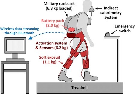 The soft exosuit is designed to assist with plantarflexion, hip flexion, and hip extension while walking. A mobile actuation system is mounted on a military rucksack, and forces generated by the actuation system are transmitted via Bowden cables to the exosuit. The controller performs an iterative force-based position control of the Bowden cables on a step-by-step basis, delivering multi-articular (plantarflexion and hip flexion) assistance during push-off and hip extension assistance in early stance. To individualize the multi-articular assistance, an online parameter tuning method was developed that customizes two control parameters to maximize the positive augmentation power delivered to the ankle. To investigate the metabolic efficacy of the exosuit with wearer-specific parameters, human subject testing was conducted involving walking on a treadmill at 1.50 m s− 1 carrying a 6.8-kg loaded rucksack. Seven participants underwent the tuning process, and the metabolic cost of loaded walking was measured with and without wearing the exosuit using the individualized control parameters.