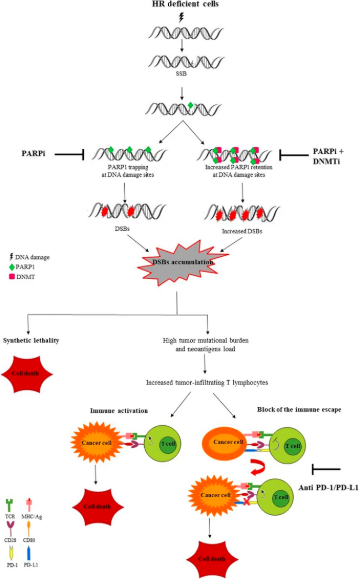 PARP inhibition, by amplifying the DNA damage, augments the mutational burden and promotes the immune priming of the tumor by increasing the neoantigen exposure and determining upregulation of programmed death ligand 1 (PD-L1) expression. Thus, the combination of PARP-inhibition and the PD/PD-L1 targeting may represent a compelling strategy to treat bladder cancer and has been introduced in recent clinical trials. The targeting of DDR has been also used in combination with epigenetic drugs able to modulate the expression of genes involved in DDR, and also able to act as immunomodulator agents suggesting their use in combination with immune-checkpoint inhibitors.