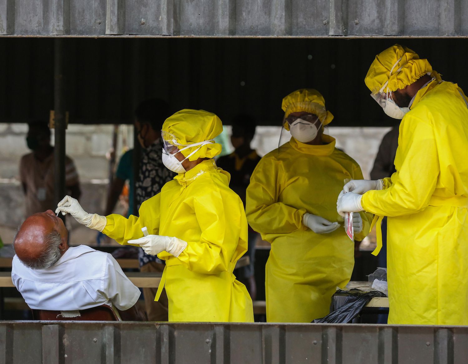Agentes colhem material para teste de coronavírus no Sri Lanka, nesta quarta.